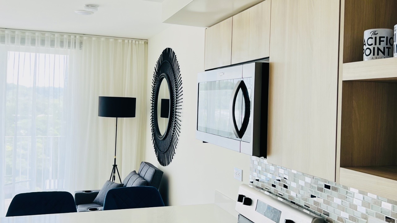 Located on the 9th floor of Pacific Point, this corner ocean view studio offers panoramic views of the Pacific and surrounding mountains, along with enhanced privacy and natural light.
