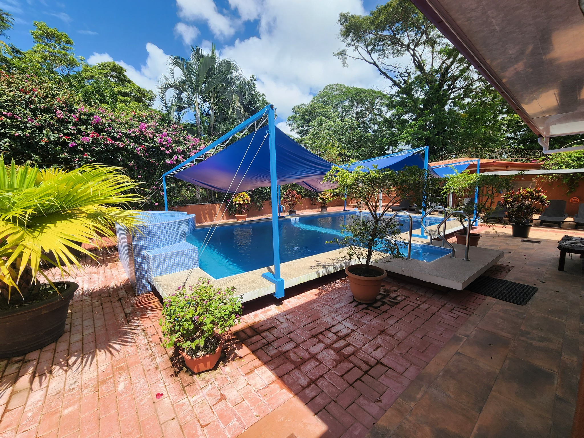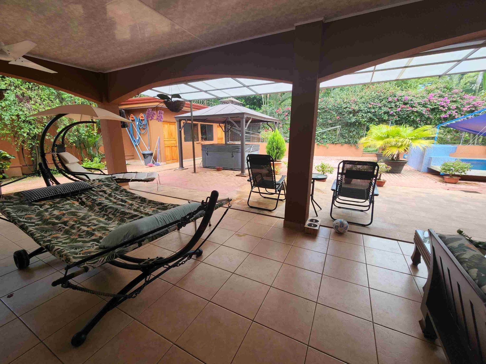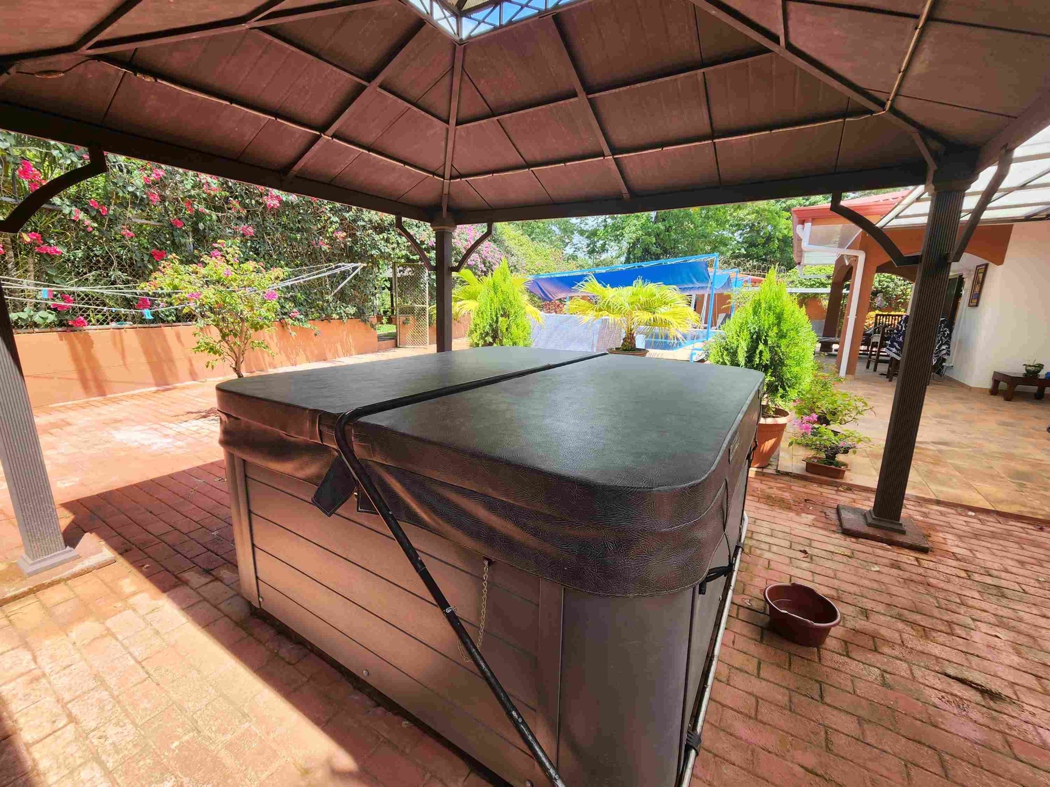 Una enorme piscina, profunda y fresca, con opción de sombra a medida. Hay un jacuzzi exterior nuevo, importado, para 12 personas con control digital de luz y flujo. Hay terraza y zonas de jardín para barbacoas, terrazas, zonas de hamacas, áreas de cocina/bar, árboles frutales, flora y fauna tropical, espacio de almacenamiento, un amplio taller para herramientas y equipos, y un gimnasio. Hay un sistema de seguridad interior y exterior con 8 cámaras, zonas cerradas para mascotas, un aparcamiento cubierto para 4 coches y un segundo garaje de dos puertas. También hay un amplio cobertizo para herramientas y un taller, todo protegido por muros altos, pero nadie puede ver el interior del complejo.