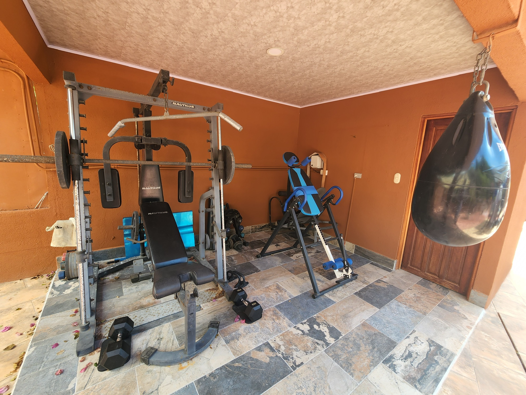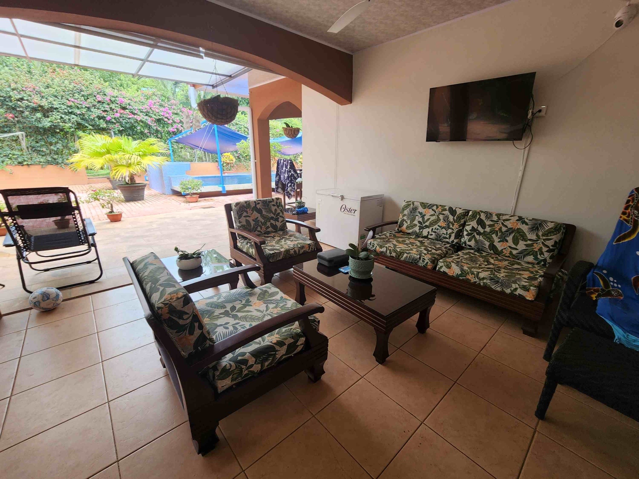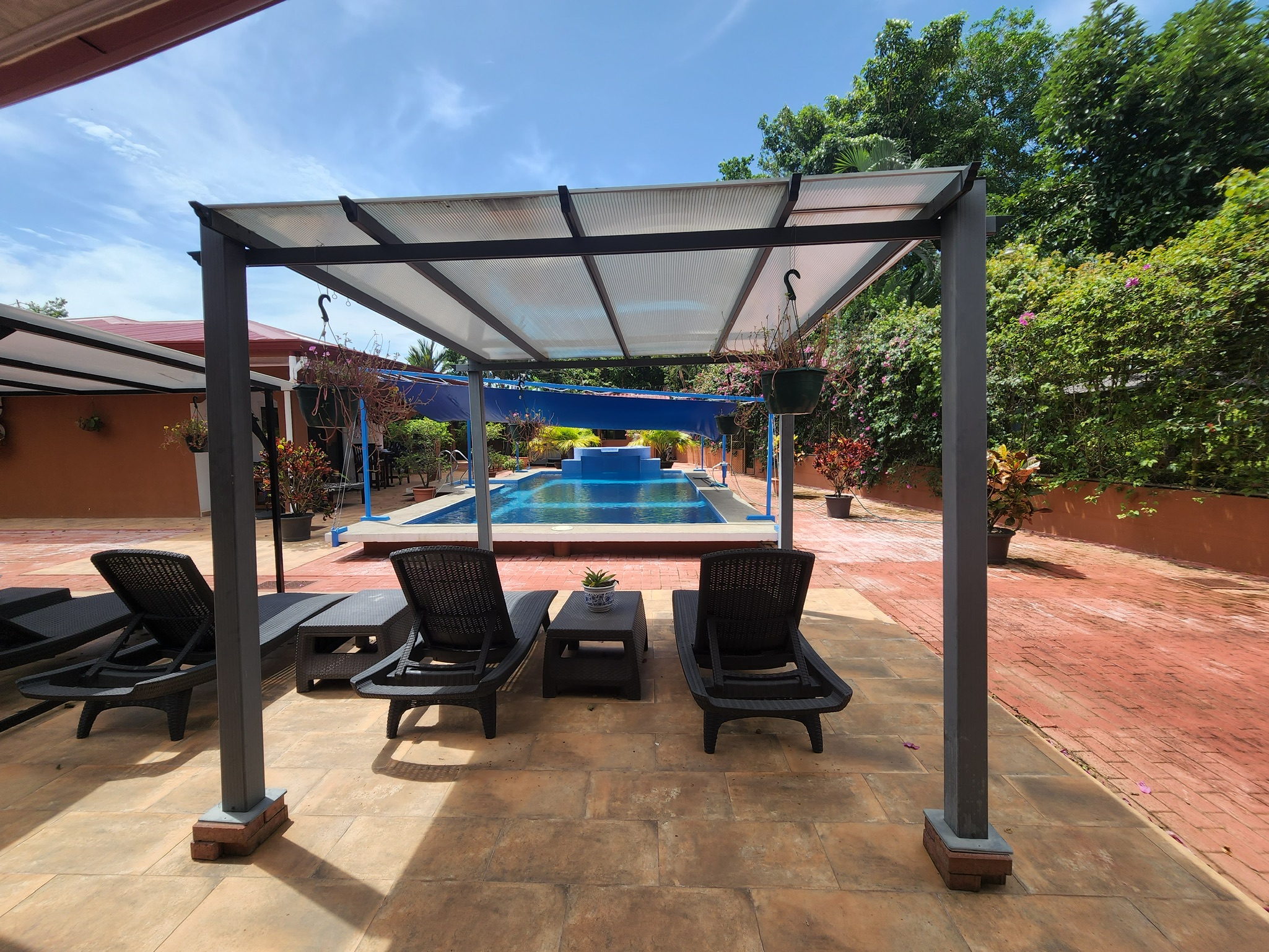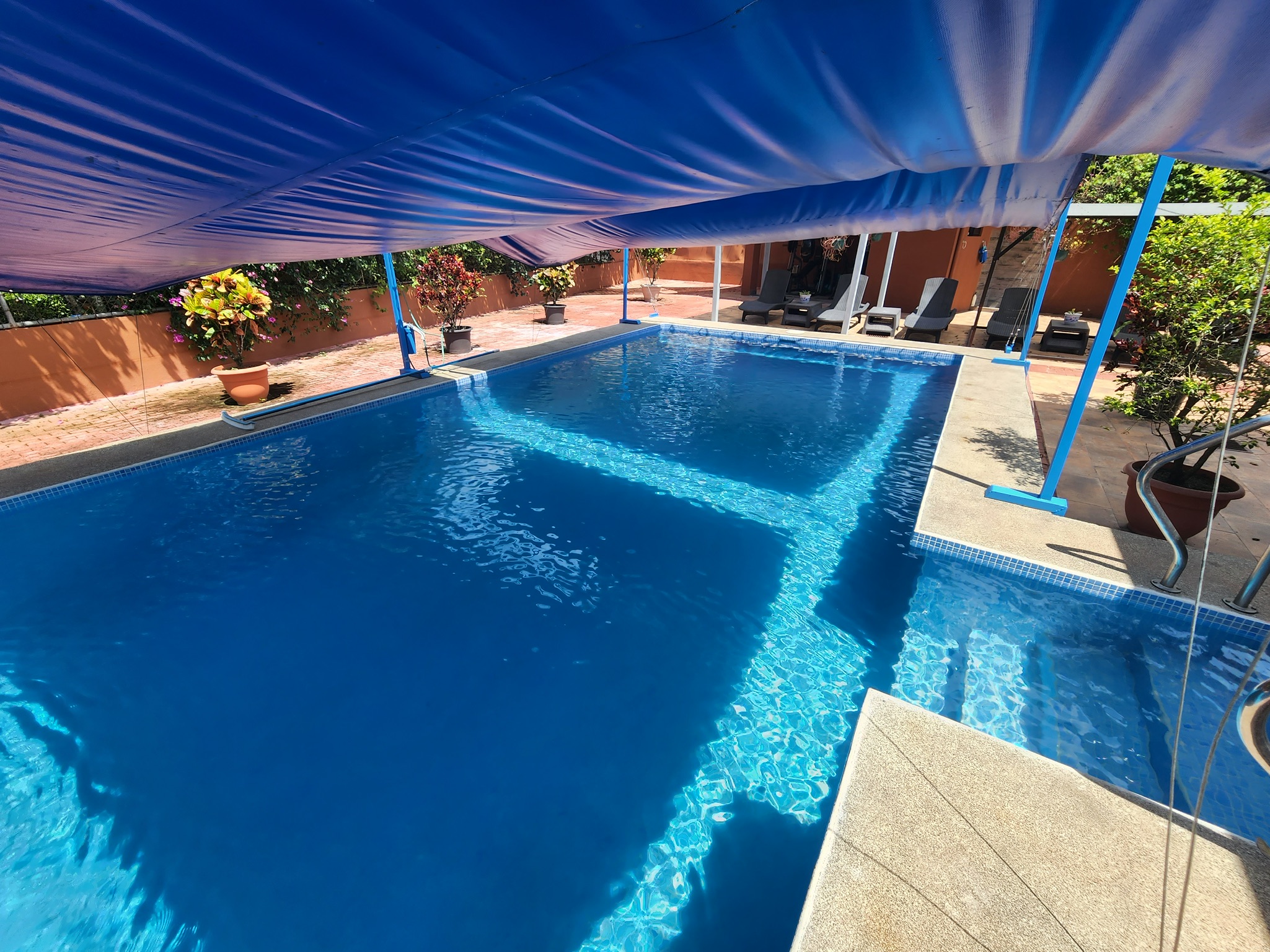 Una enorme piscina, profunda y fresca, con opción de sombra a medida. Hay un jacuzzi exterior nuevo, importado, para 12 personas con control digital de luz y flujo. Hay terraza y zonas de jardín para barbacoas, terrazas, zonas de hamacas, áreas de cocina/bar, árboles frutales, flora y fauna tropical, espacio de almacenamiento, un amplio taller para herramientas y equipos, y un gimnasio. Hay un sistema de seguridad interior y exterior con 8 cámaras, zonas cerradas para mascotas, un aparcamiento cubierto para 4 coches y un segundo garaje de dos puertas. También hay un amplio cobertizo para herramientas y un taller, todo protegido por muros altos, pero nadie puede ver el interior del complejo.