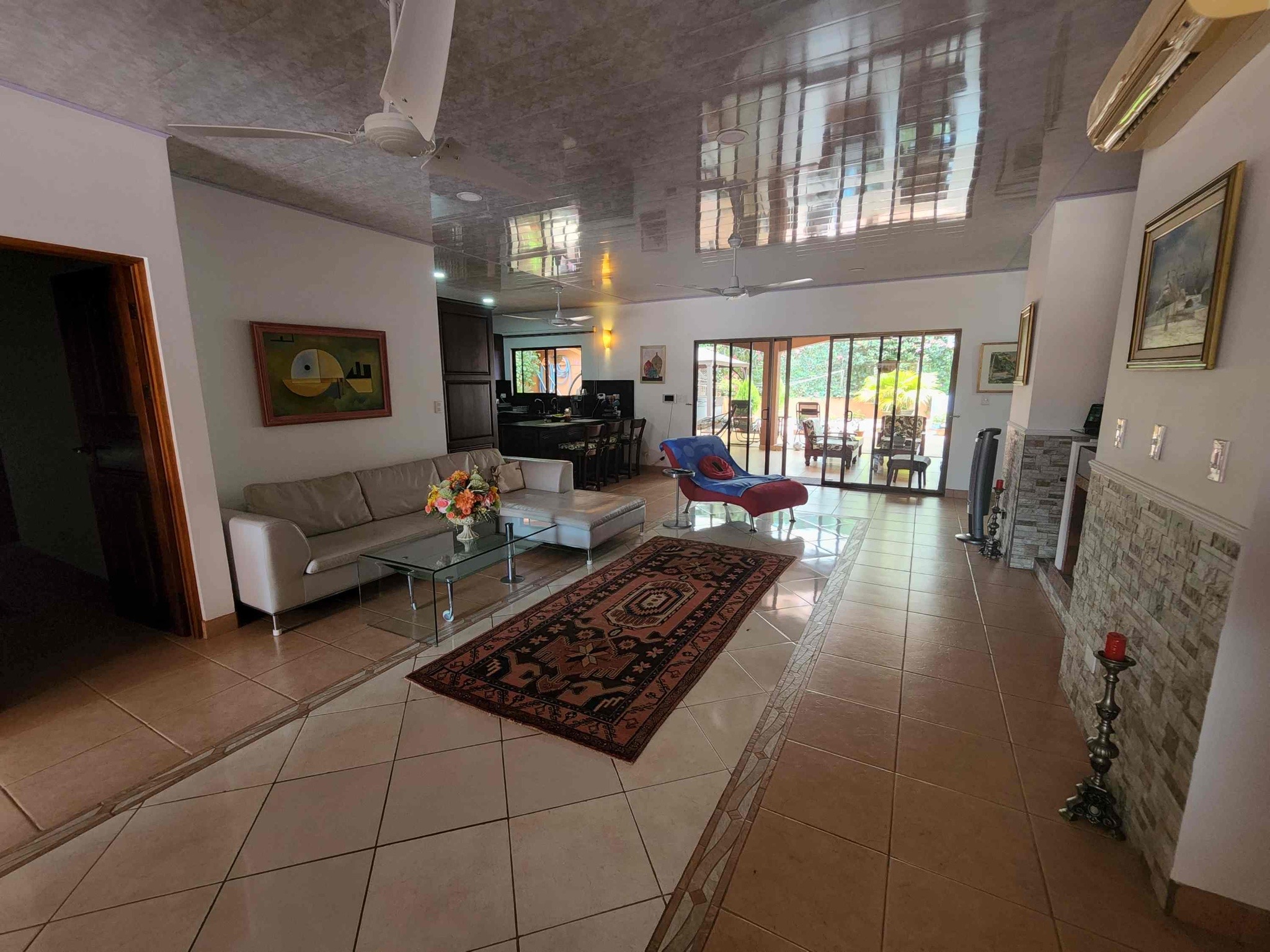 MAIN HOUSE: a “ranch style” (one level) spacious home of 275 m2 (2960 sq. ft.), open floor plan, living room, and the kitchen has a “communal” feel. 2 guest bedrooms, each with their own full bathrooms. The Master Bedroom is very spacious, w. room for a king sized bed and couches, as well as an incredible master bathroom, complete w. a “party size” Jacuzzi tub, in addition to an equally large shower!