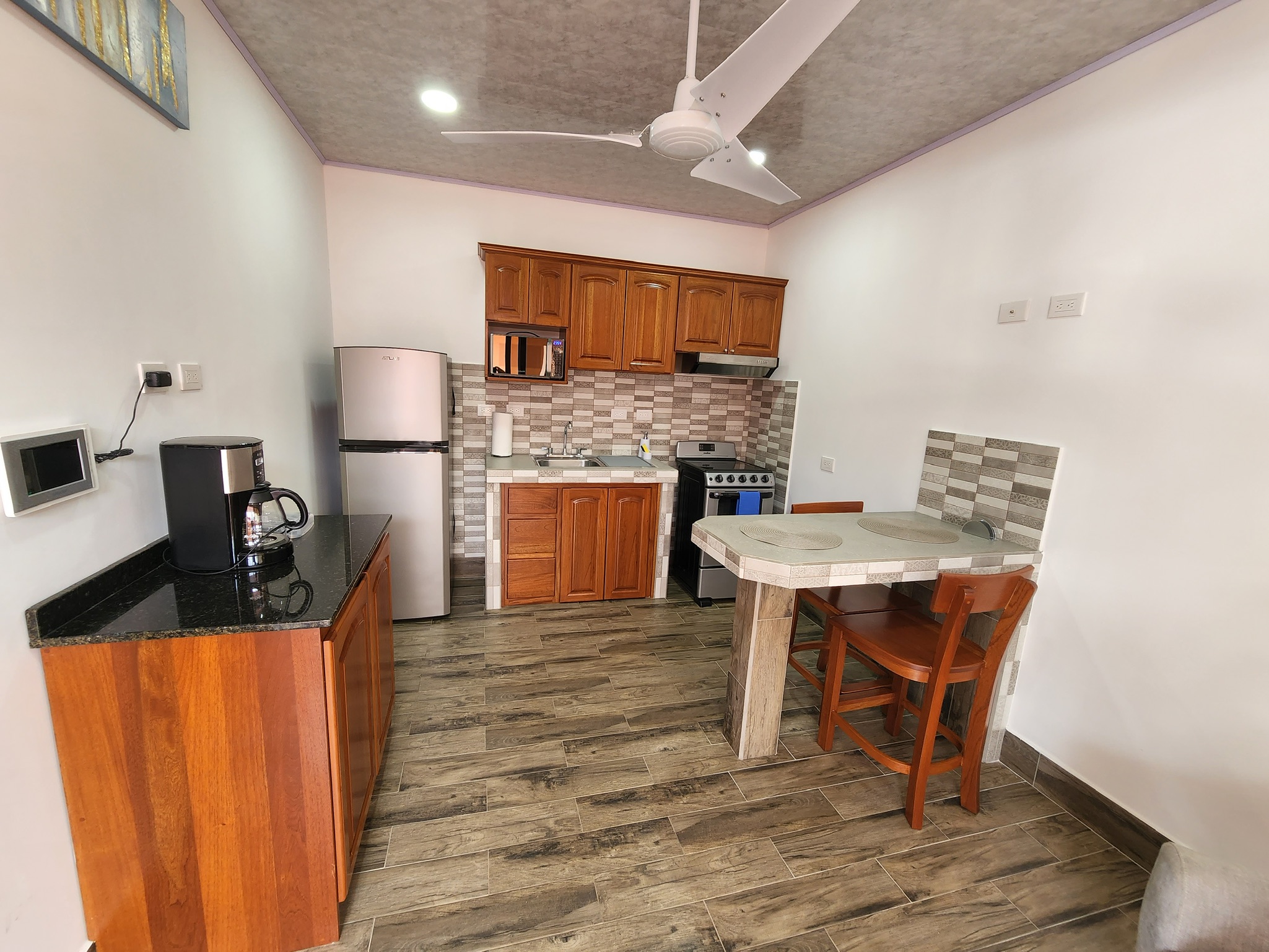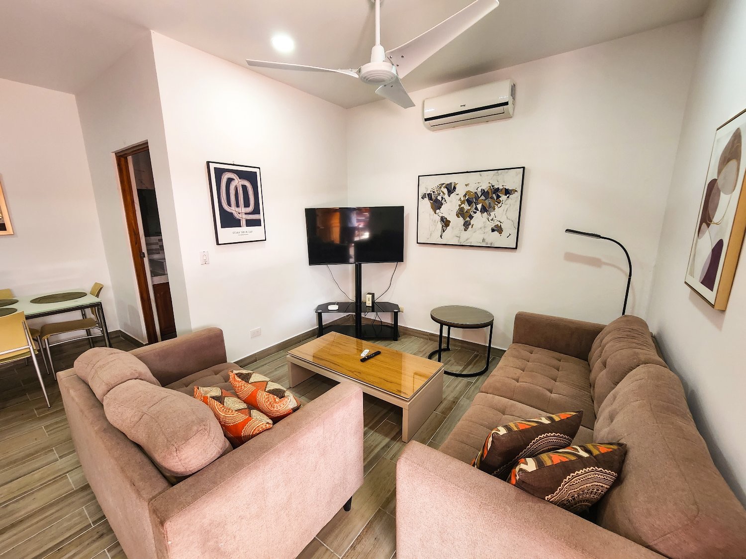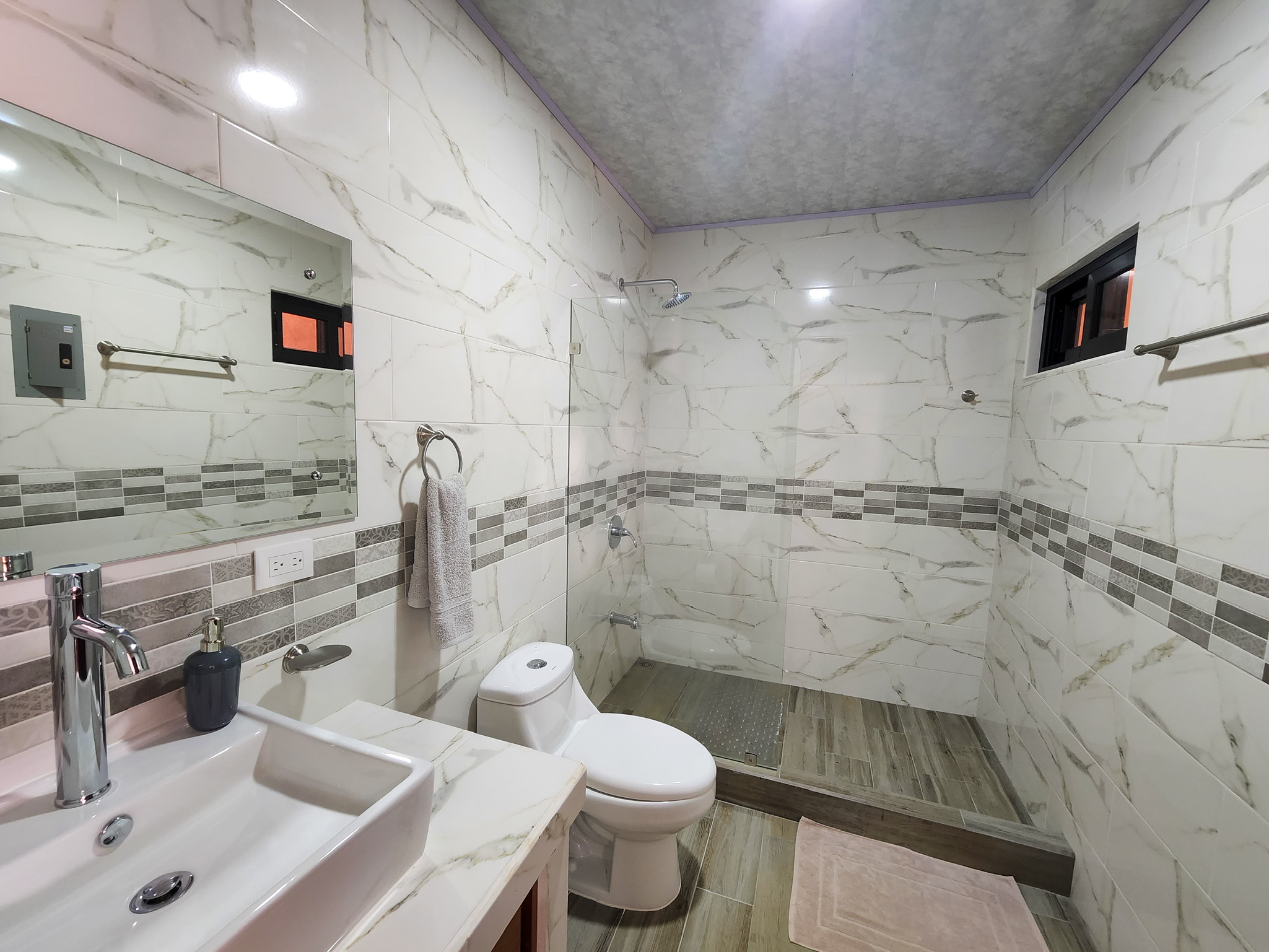 Dúplex de dos plantas: Dos apartamentos idénticos de estilo moderno de 110 m² (1185 pies cuadrados) cada uno. Las unidades de la planta alta y la planta baja son independientes; cada unidad cuenta con dos dormitorios, un baño completo, sala de estar y cocina.