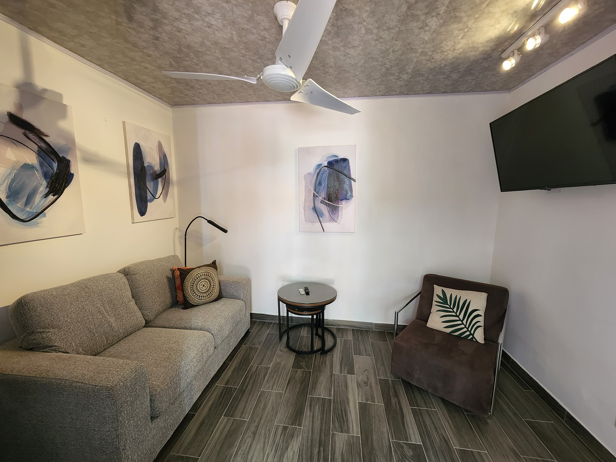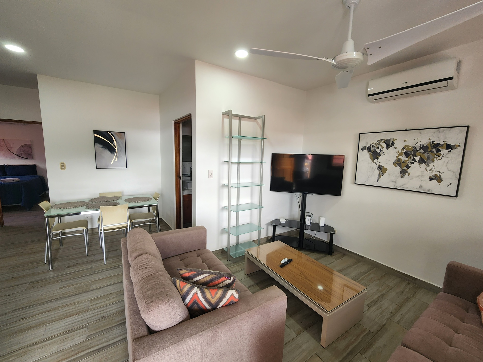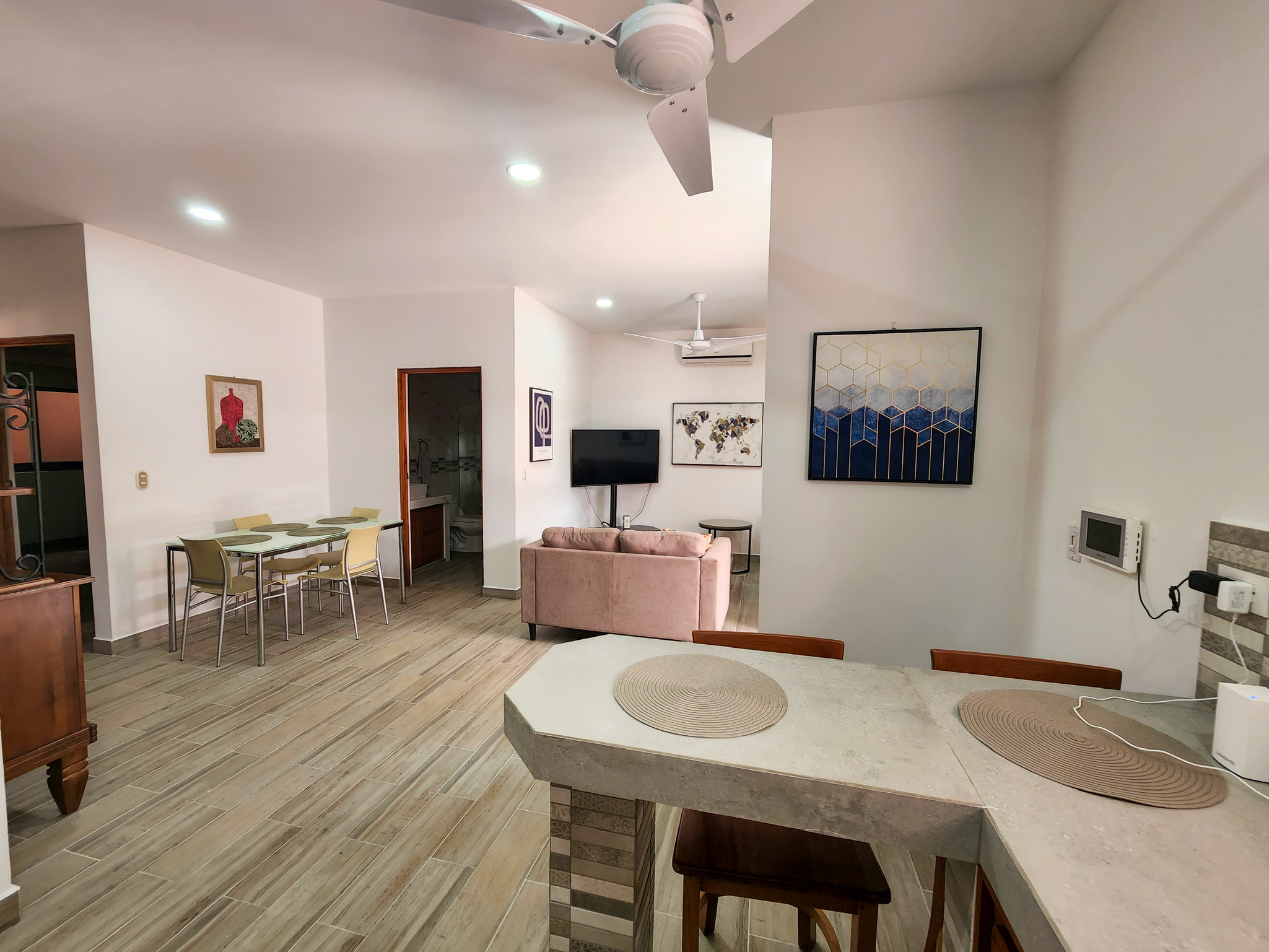 Dúplex de dos plantas: Dos apartamentos idénticos de estilo moderno de 110 m² (1185 pies cuadrados) cada uno. Las unidades de la planta alta y la planta baja son independientes; cada unidad cuenta con dos dormitorios, un baño completo, sala de estar y cocina.
